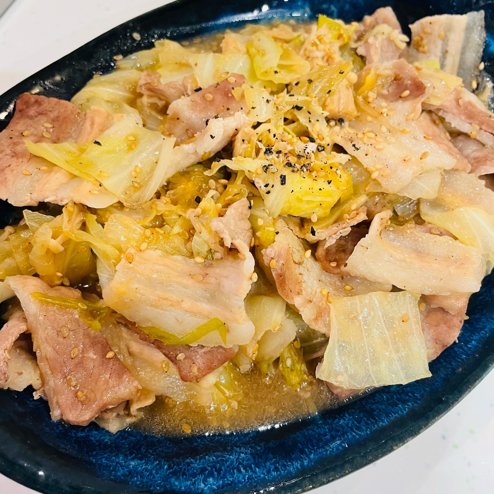 レシピタイトル:豚バラ肉とキャベツ蒸し