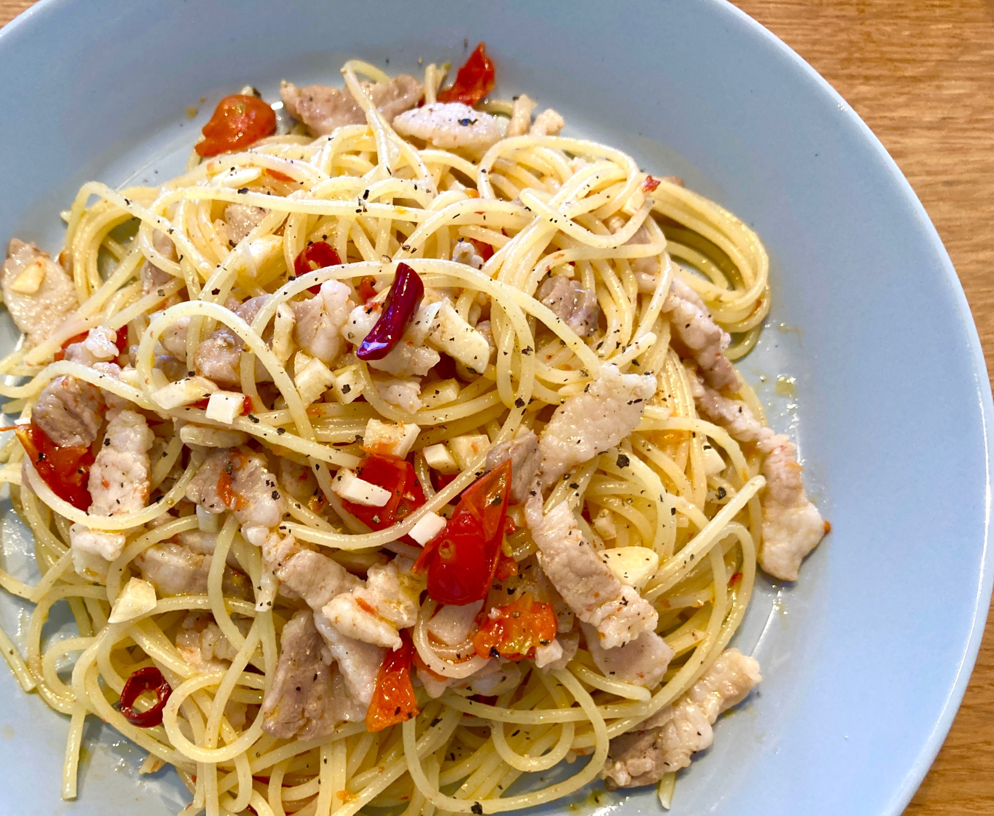 :自家製セミドライトマト(オリーブオイル漬け)と少しだけ余っていた焼肉用の豚バラ肉を使ってペペロンチーノにしてみました♪