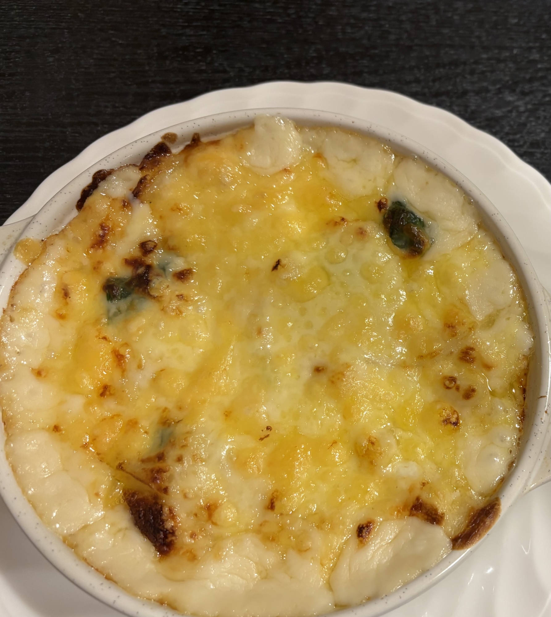 レシピタイトル:国産チーズで♪鮭とほうれん草のマカロニグラタン
