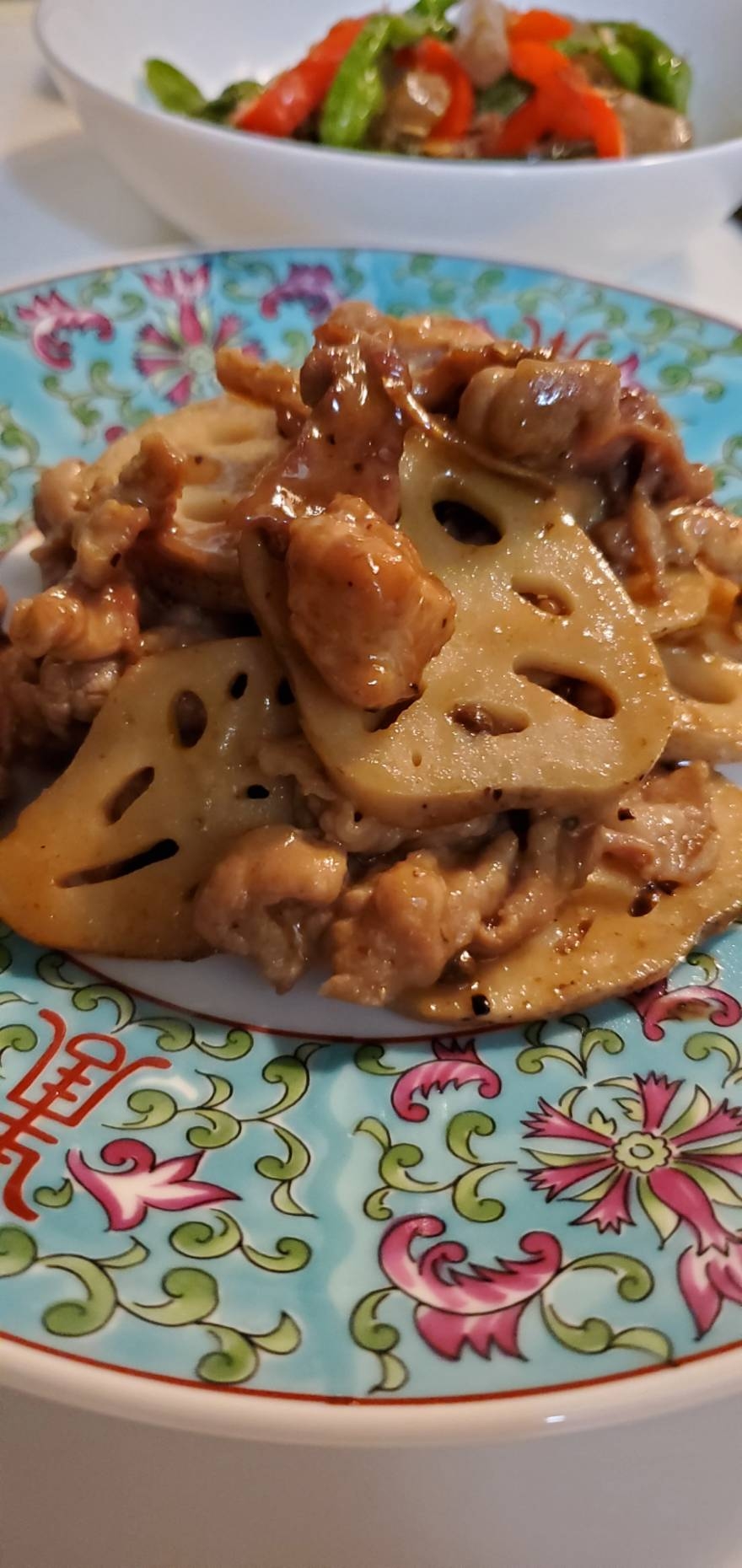 レシピタイトル:豚肉とレンコンの黒酢炒め