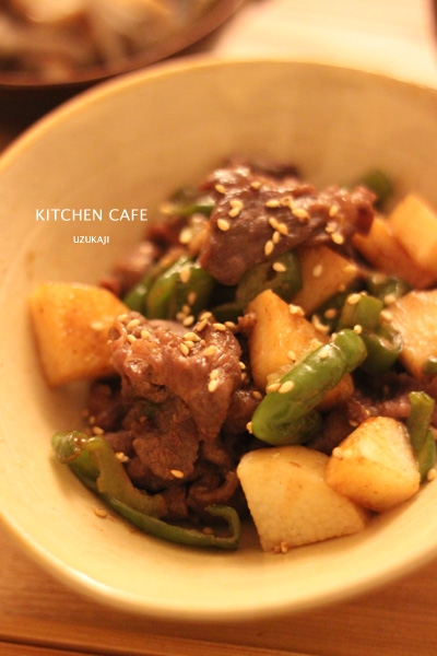 レシピタイトル:牛肉と長いもの甘辛炒め