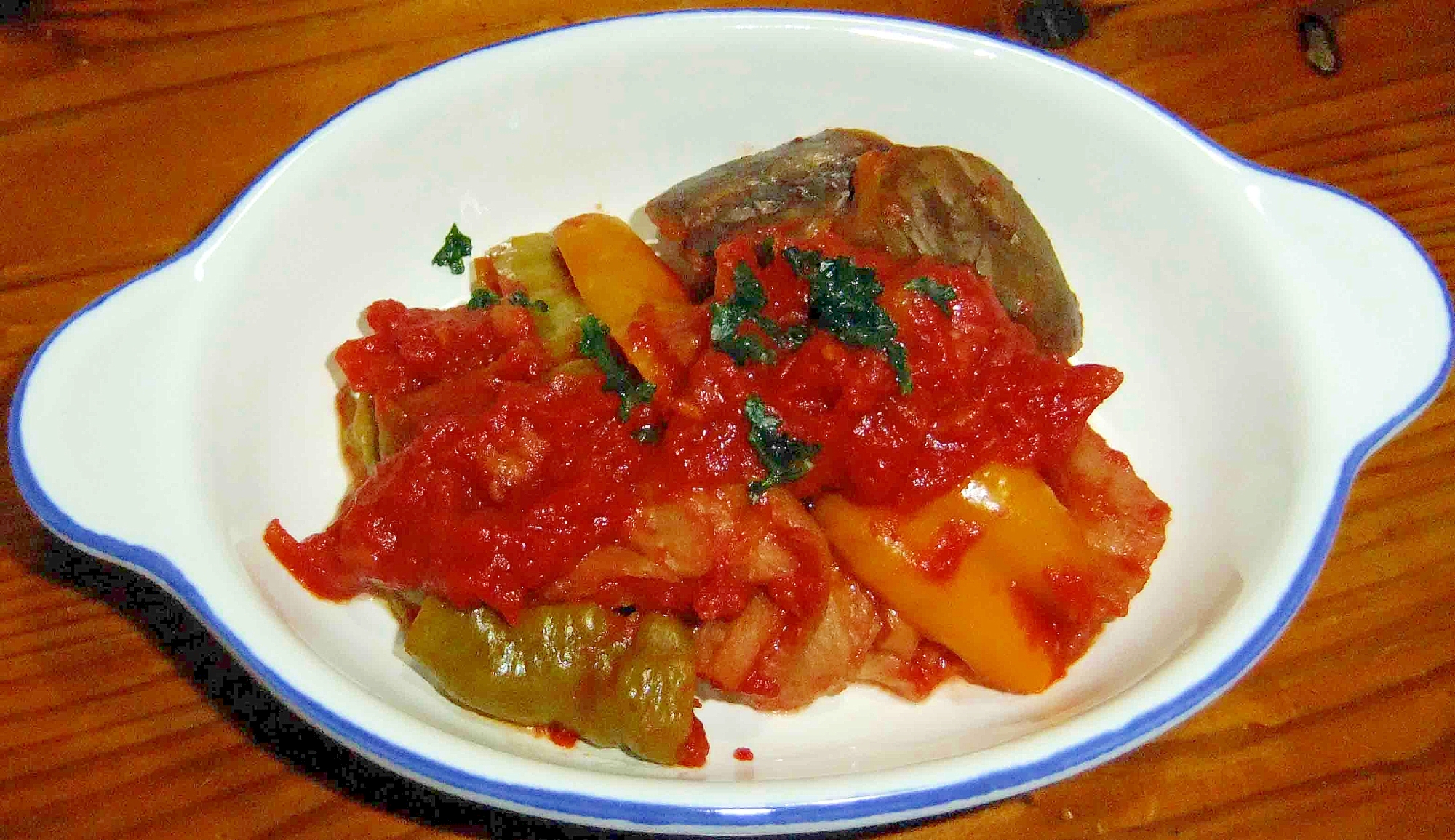 レシピを考えた人のコメント:夏野菜も、最後ですね トマトの赤が元気な煮物です