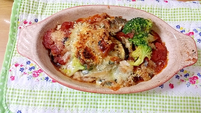 レシピタイトル:いわしと茄子の重ね焼きグラタン風