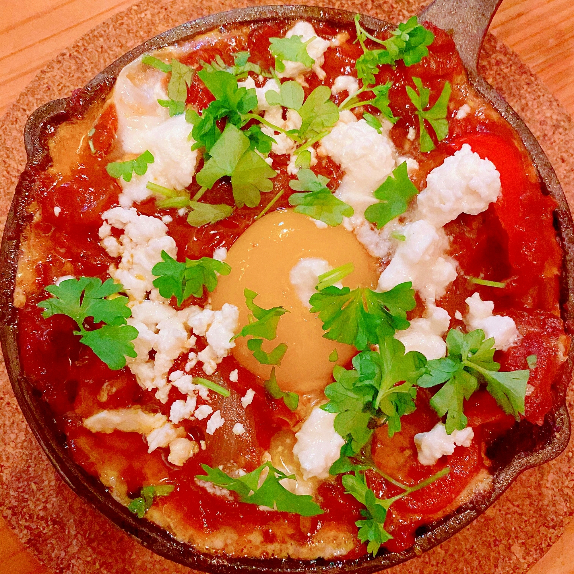 :野菜をベースにしたピリ辛の煮込みに、卵を落として食べる料理。 ソースのピリ辛さと卵のまろやかさで、パンを絡める手が止まりません。