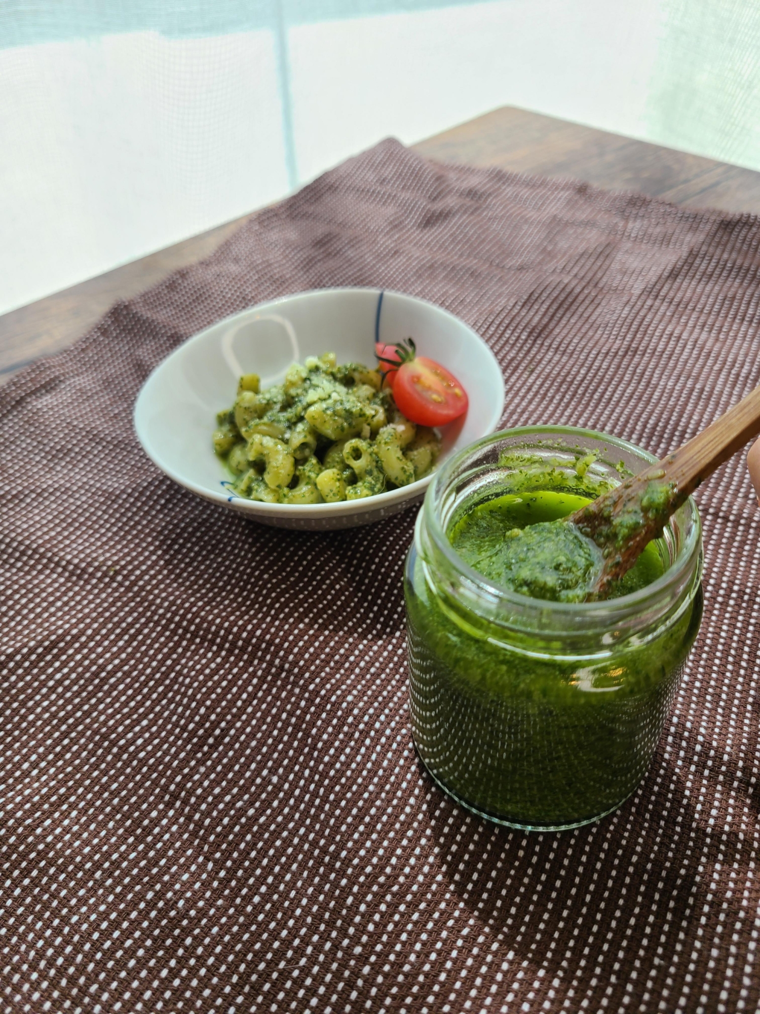 :松の実の代用としてピーナッツを使用したレシピです。 作ったソースは、瓶詰めの冷蔵保存と、ジッパー付き袋に入れた冷凍保存用の2つに分けました。