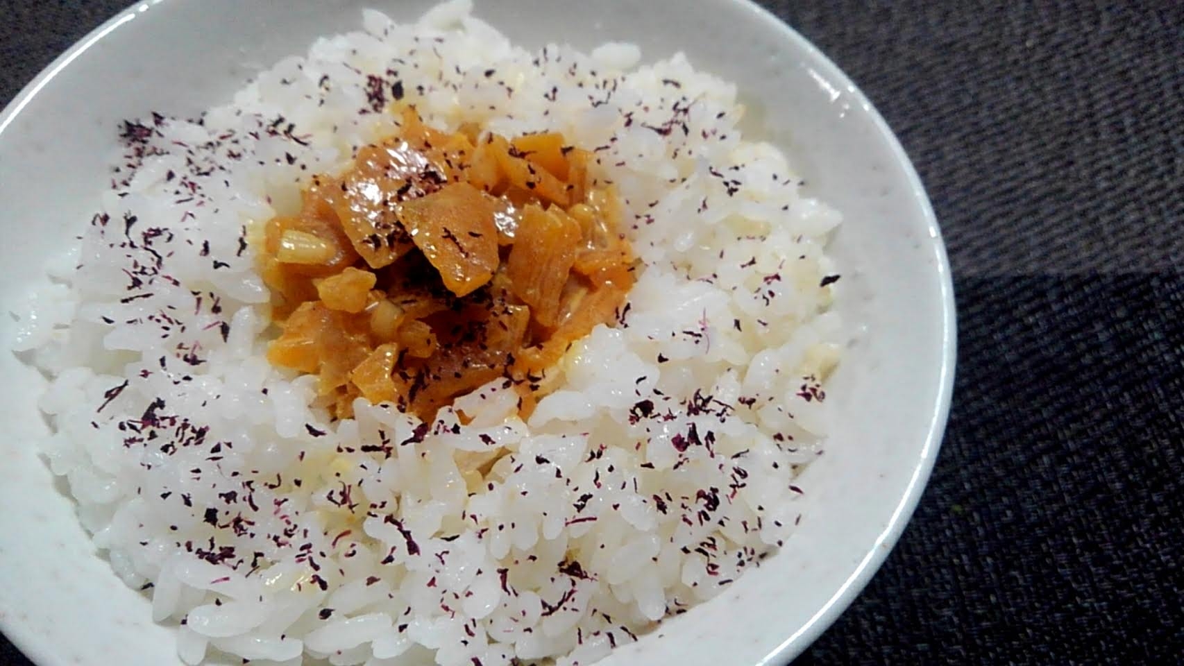 レシピタイトル:福神漬けマヨ醤油とゆかりのご飯(*´ω`人
