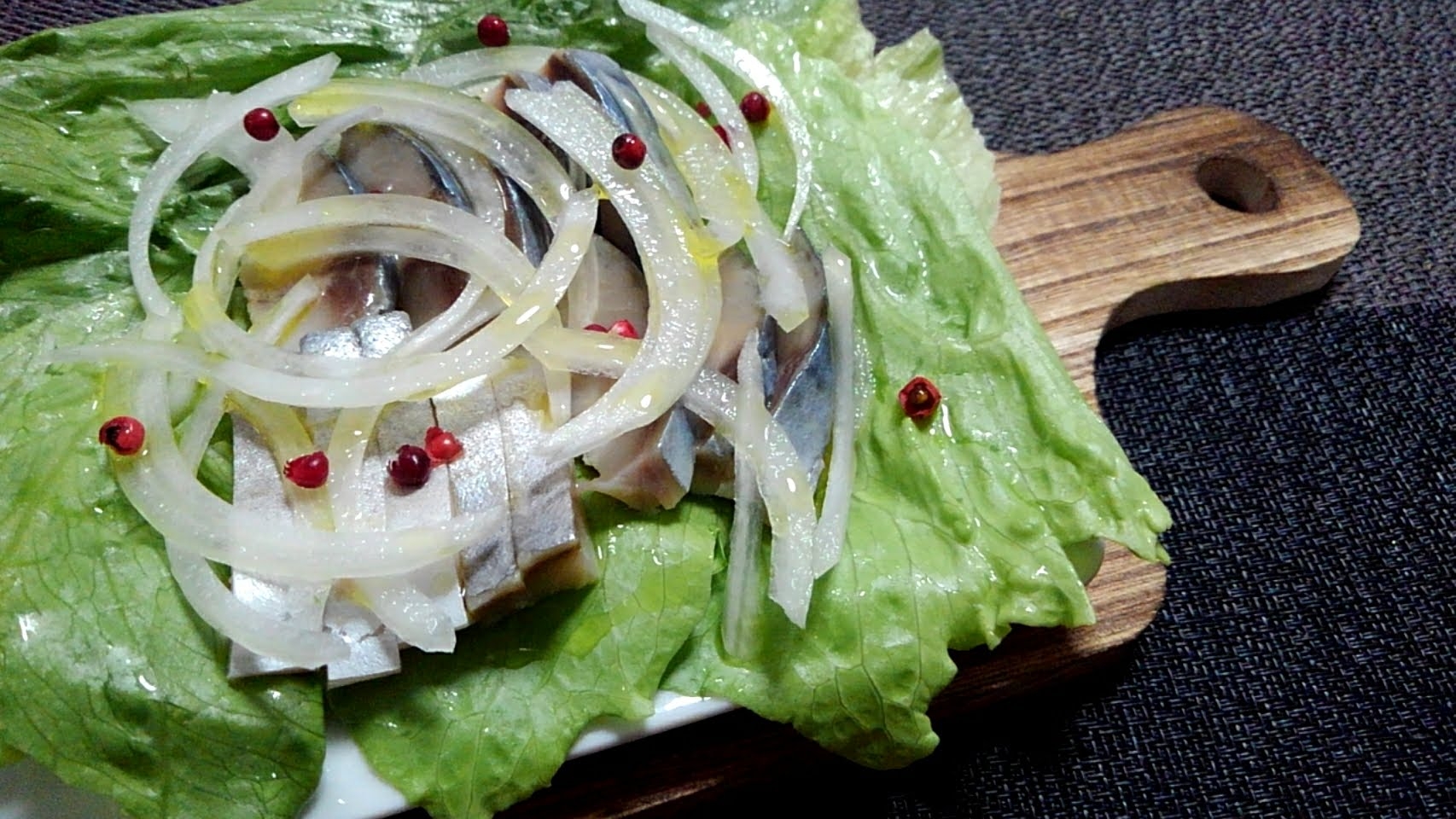 しめ鯖のオリーブオイルがけ×オニオンピンクペッパー