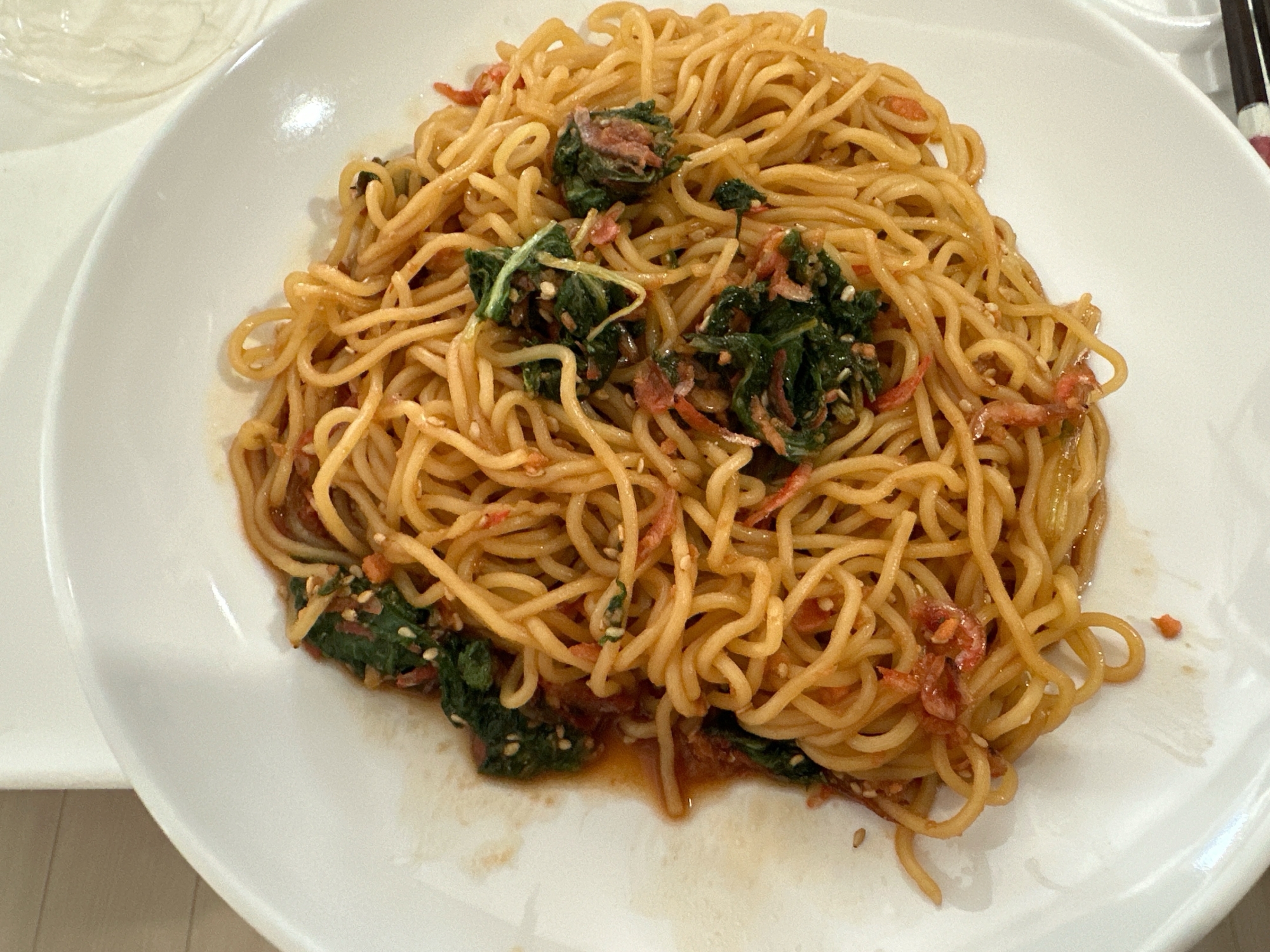 レシピタイトル:水菜干しエビ鮭がのったお醤油焼きそば