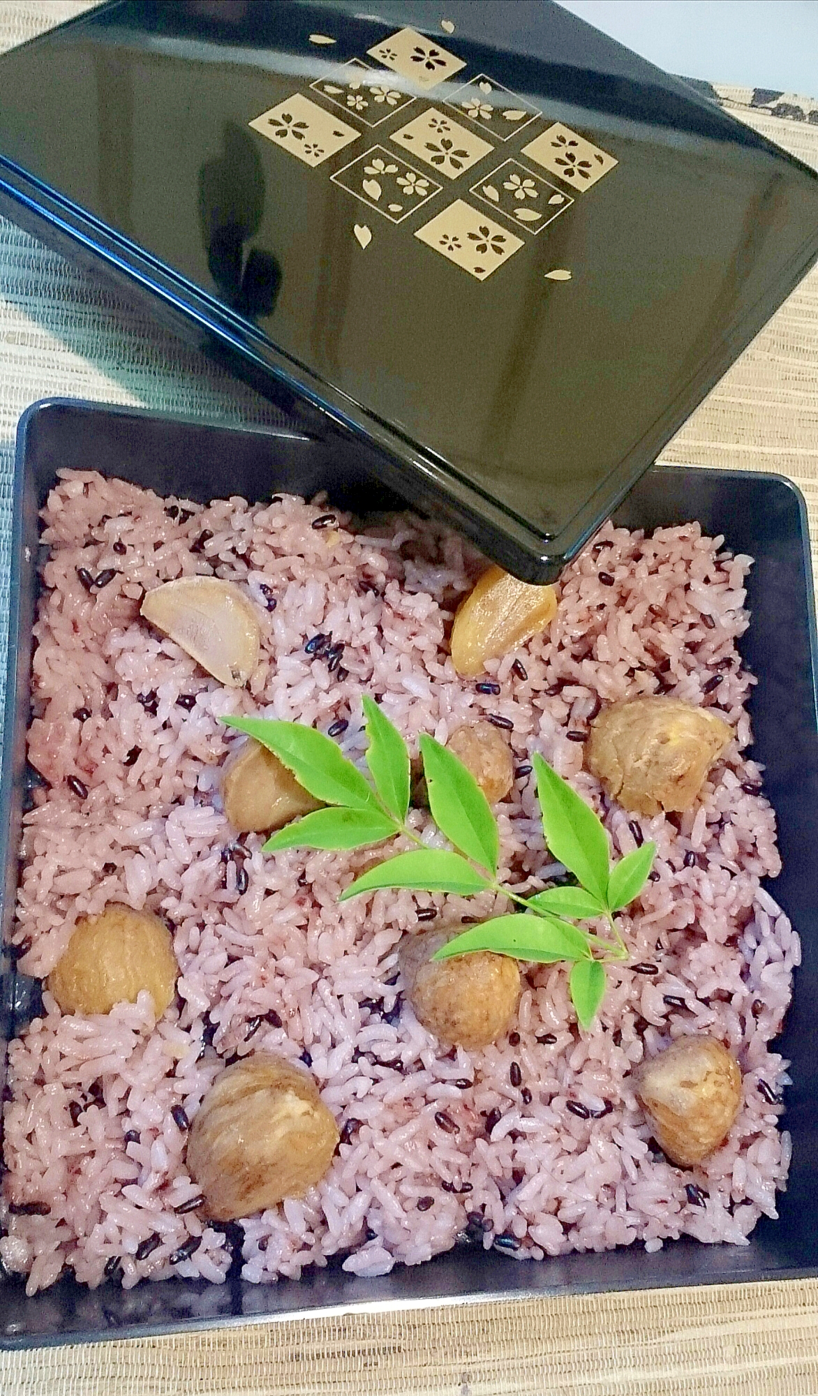 :栗のむきやすい方法。 栗を別に甘く煮て、 炊いたあとで栗を加えます。黒米で色鮮やかで美味しい栗ご飯です。 夕食やおめでたい日や運動会などに、いかがですか♪