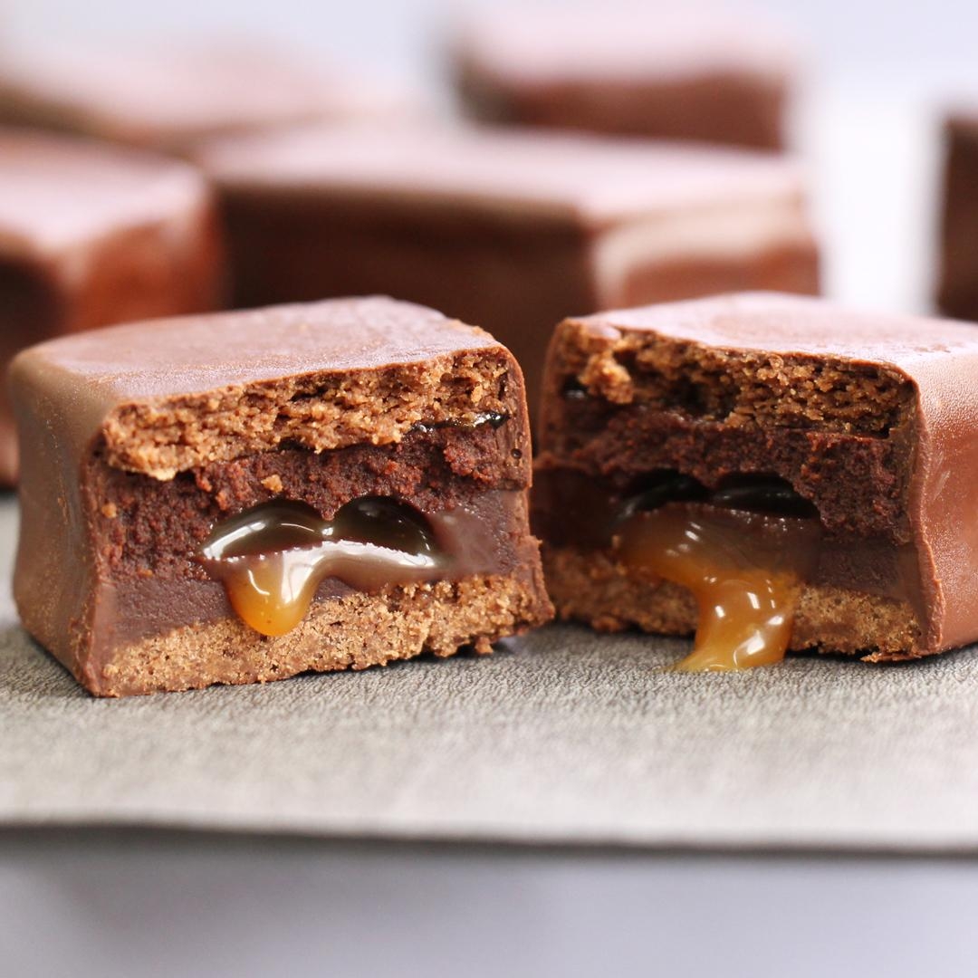 :贅沢な4層仕立て。 サクットロッとリッチな味わいが重なるチョコレートのお菓子です。 特別なバレンタインの贈り物にいががですか?