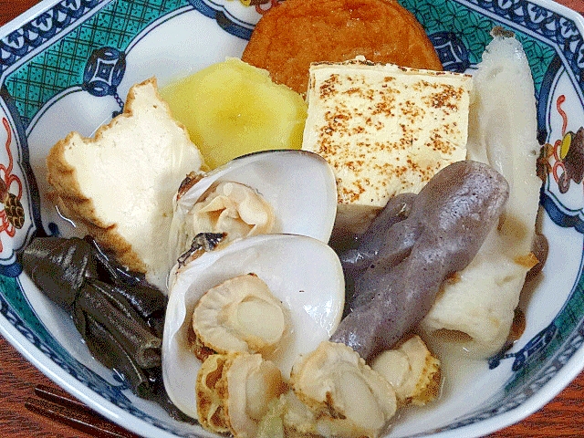 :冷凍のハマグリとシジミ、ボイルホタテを煮出してとった海鮮だしは濃厚で、これで作った「塩おでん」はおもてなし用にもなる絶品です。