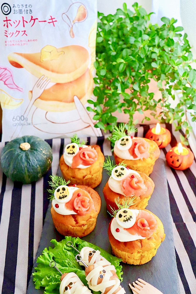 :かぼちゃのペーストをたっぷり入れたほんのり甘い生地に、ウィンナーや野菜たっぷりの甘塩っぱいケークサレです。 ハロウィン仕様で、ちょっぴりおめかししてみました♪