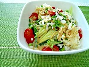 :上に乗せる具は長芋やオクラ等でも何でもOKです。胡麻ドレと青シソドレっシングを掛けると冷やし中華のような味付けになります!