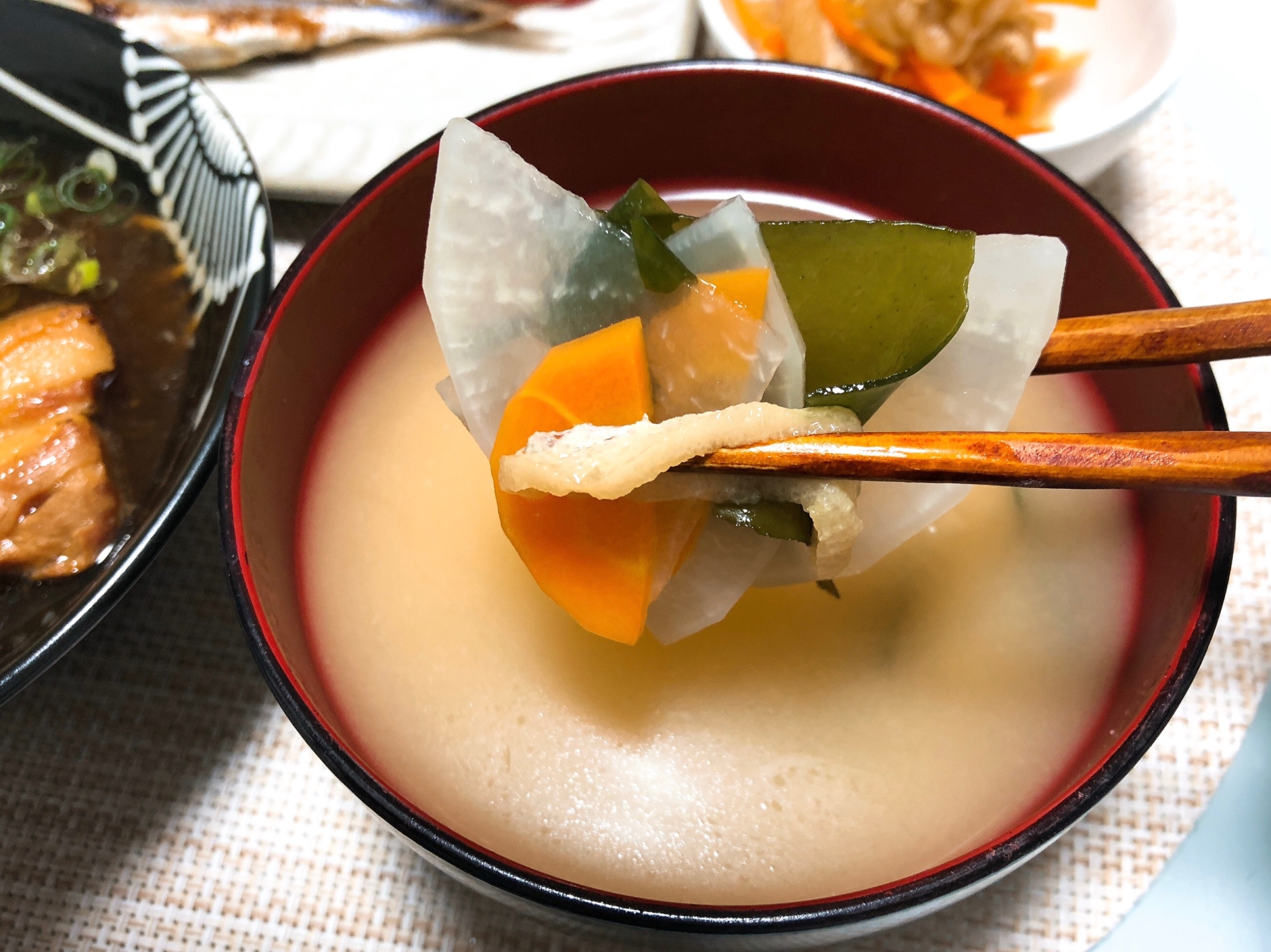 :家にある少し残ってしまっている食材を入れて作りました。具沢山お味噌汁にすると食材の出汁で味が変わるので、個人的に気に入っています。