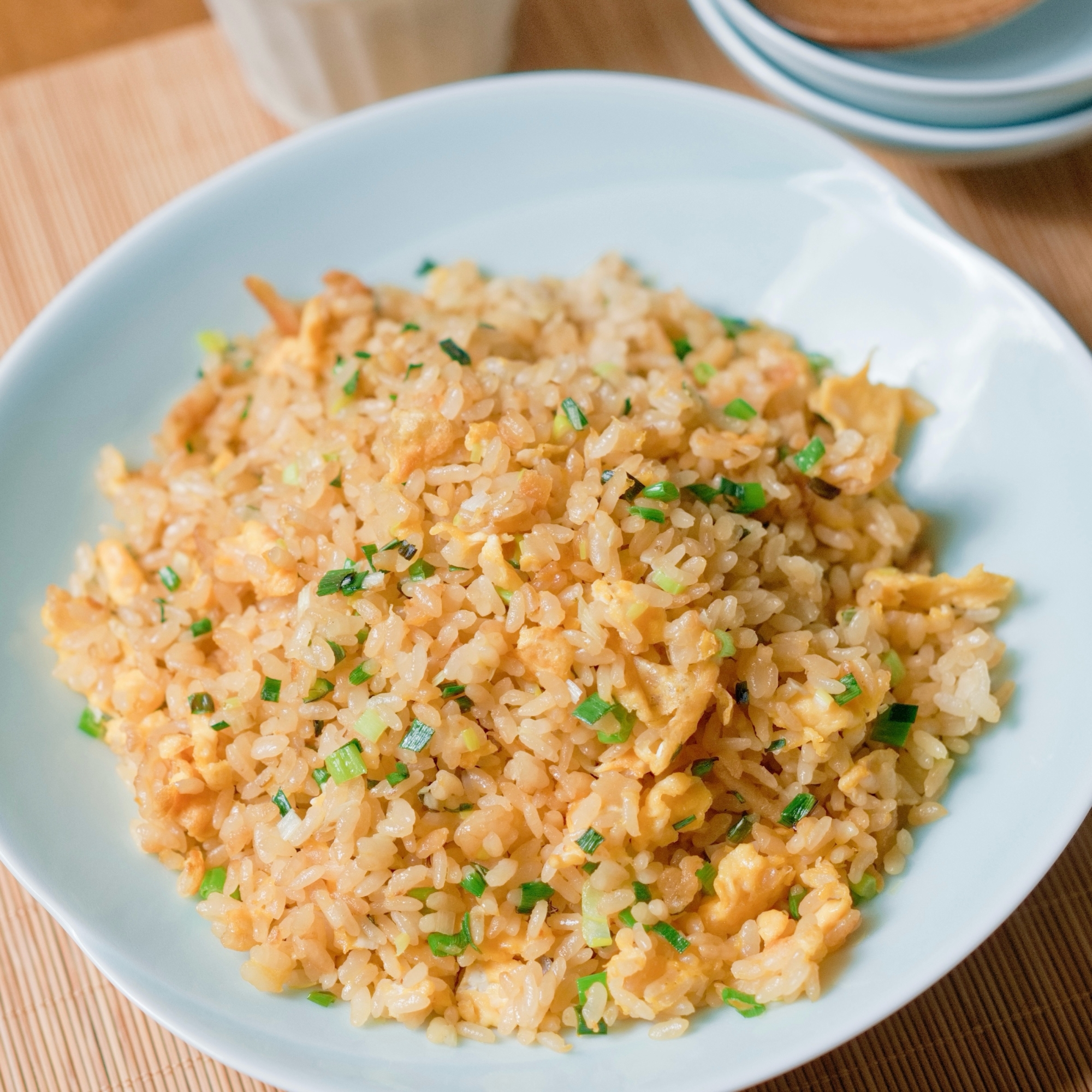 :鶏の香りが食欲をそそる! カリッとした鶏皮を具にした、鶏油(チー油)のうまみが米一粒一粒を包み込む絶品チャーハンです。