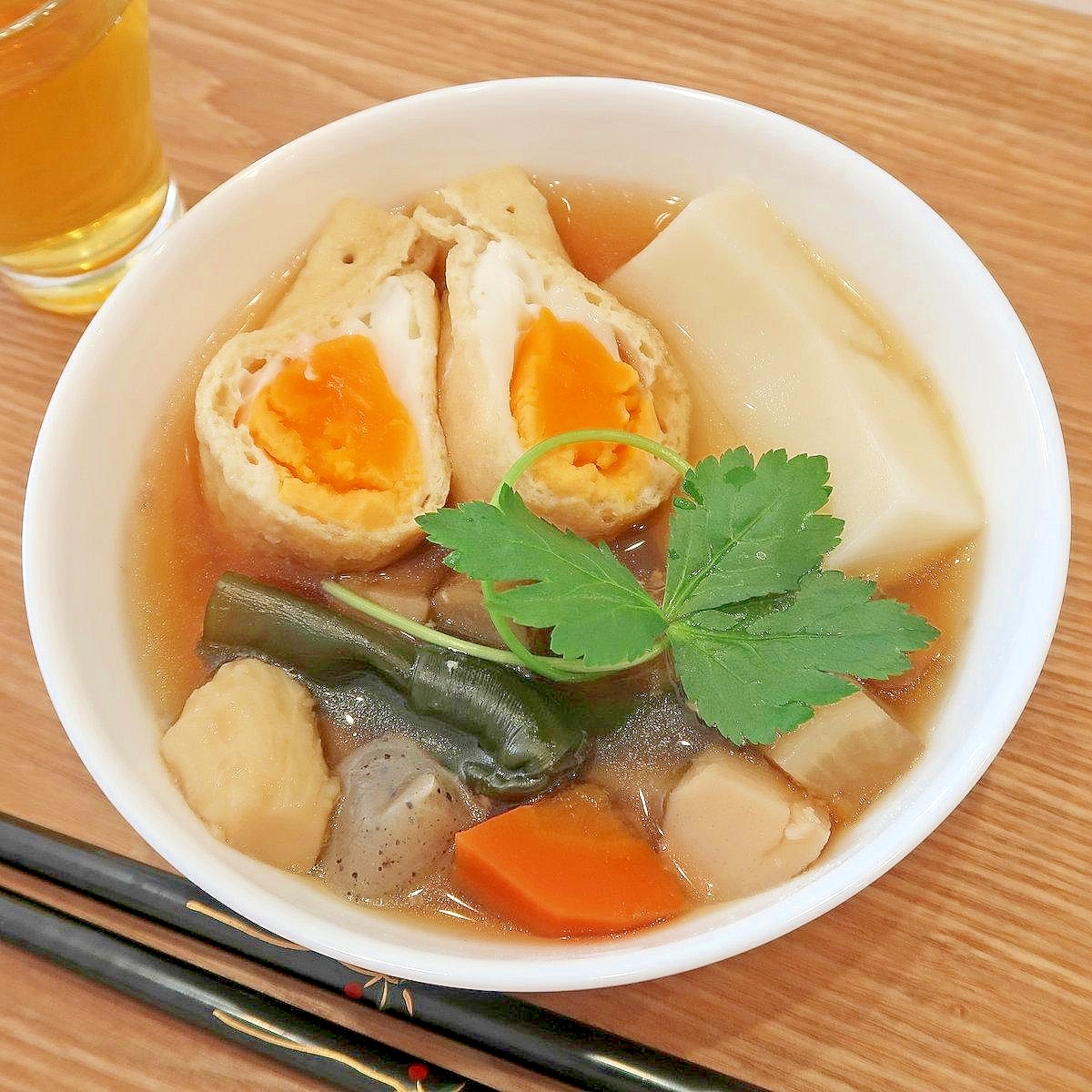 煮しめに卵巾着と餅☆煮しめリメイク☆アレンジお雑煮