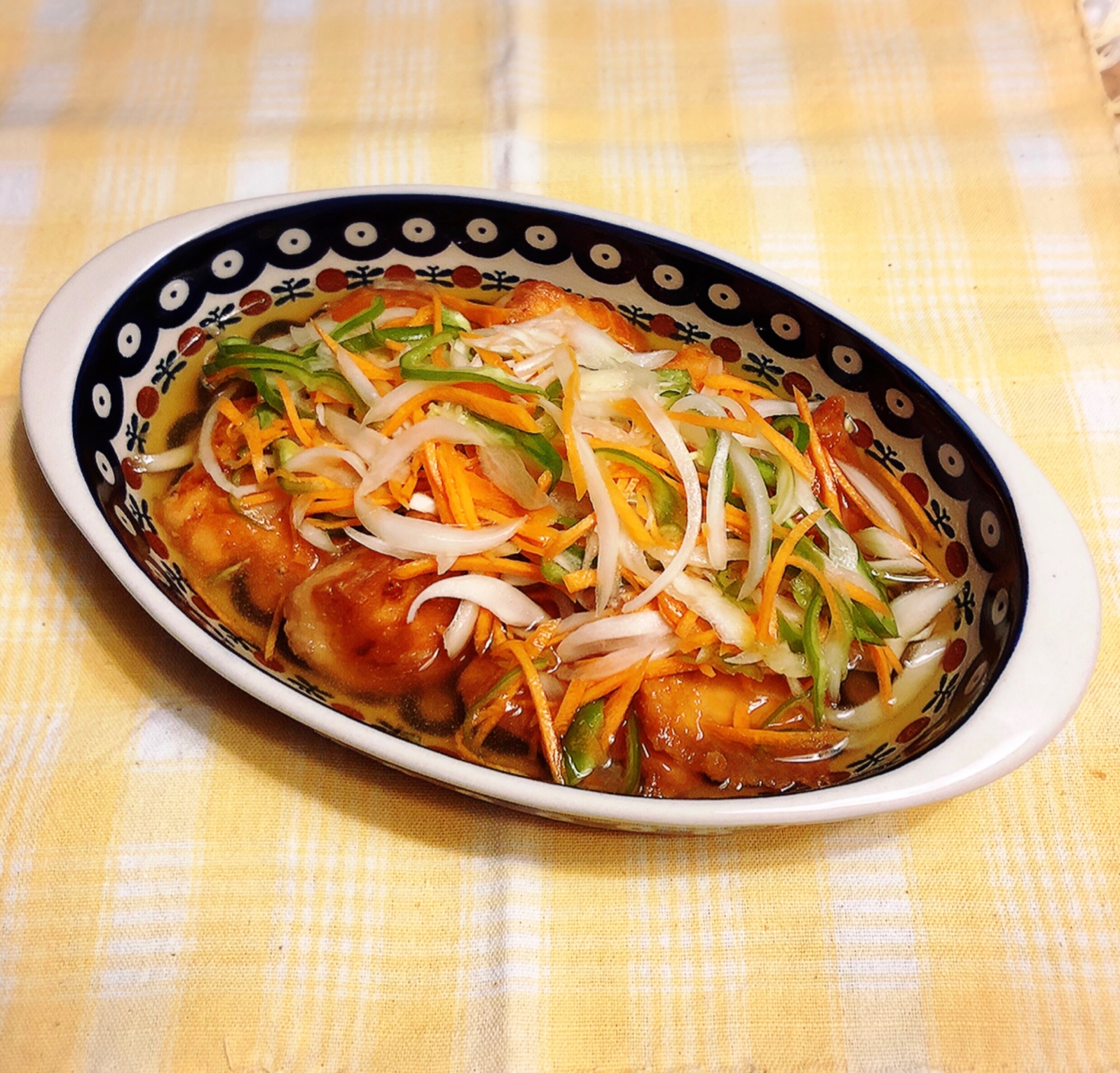 :揚げ焼き、お野菜たっぷりであっさりといただけます。 今回は米会員制倉庫型スーパーのサーモンを使用しました。