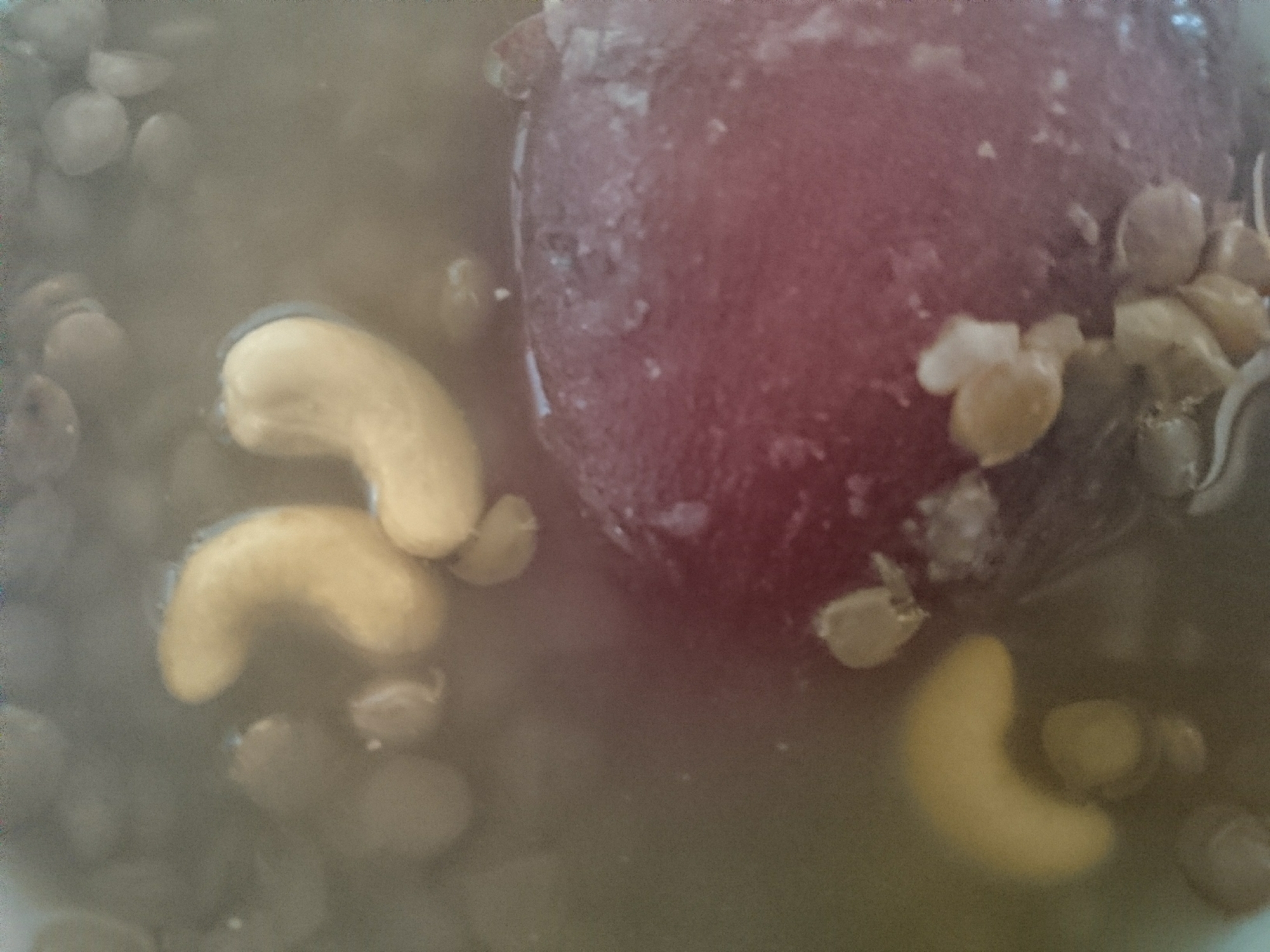 :さつまいも(鳴門金時)、塩味カシューナッツ(味源 4種のほんのり塩味ハッピーミックスナッツ)、皮付きレンズ豆を使った簡単おかずスープです。
