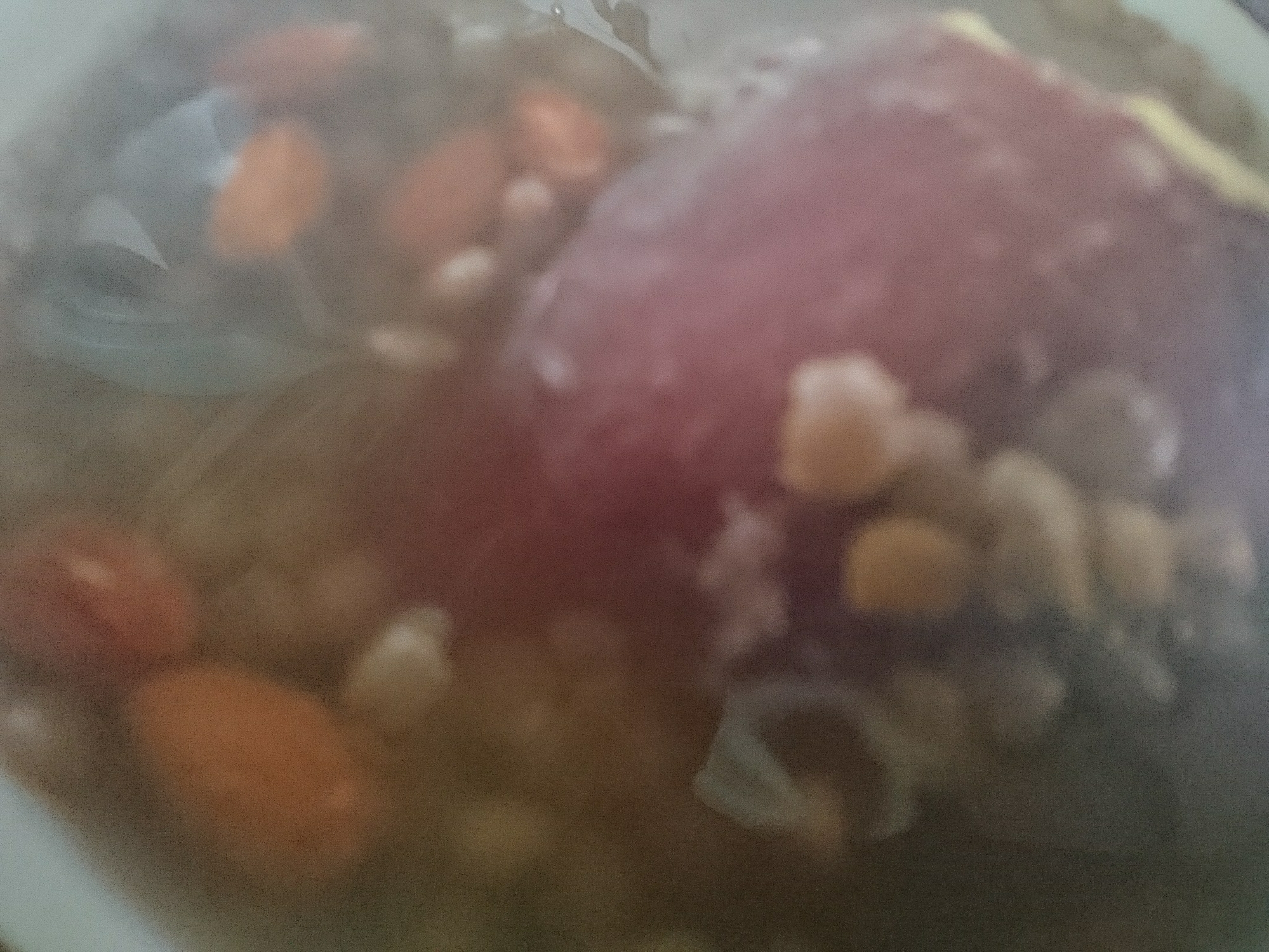 :さつまいも(鳴門金時)、塩味素焼きアーモンド(味源 4種のほんのり塩味ハッピーミックスナッツ)、皮付きレンズ豆(アメリカ産 乾燥)を使った簡単おかずスープです。