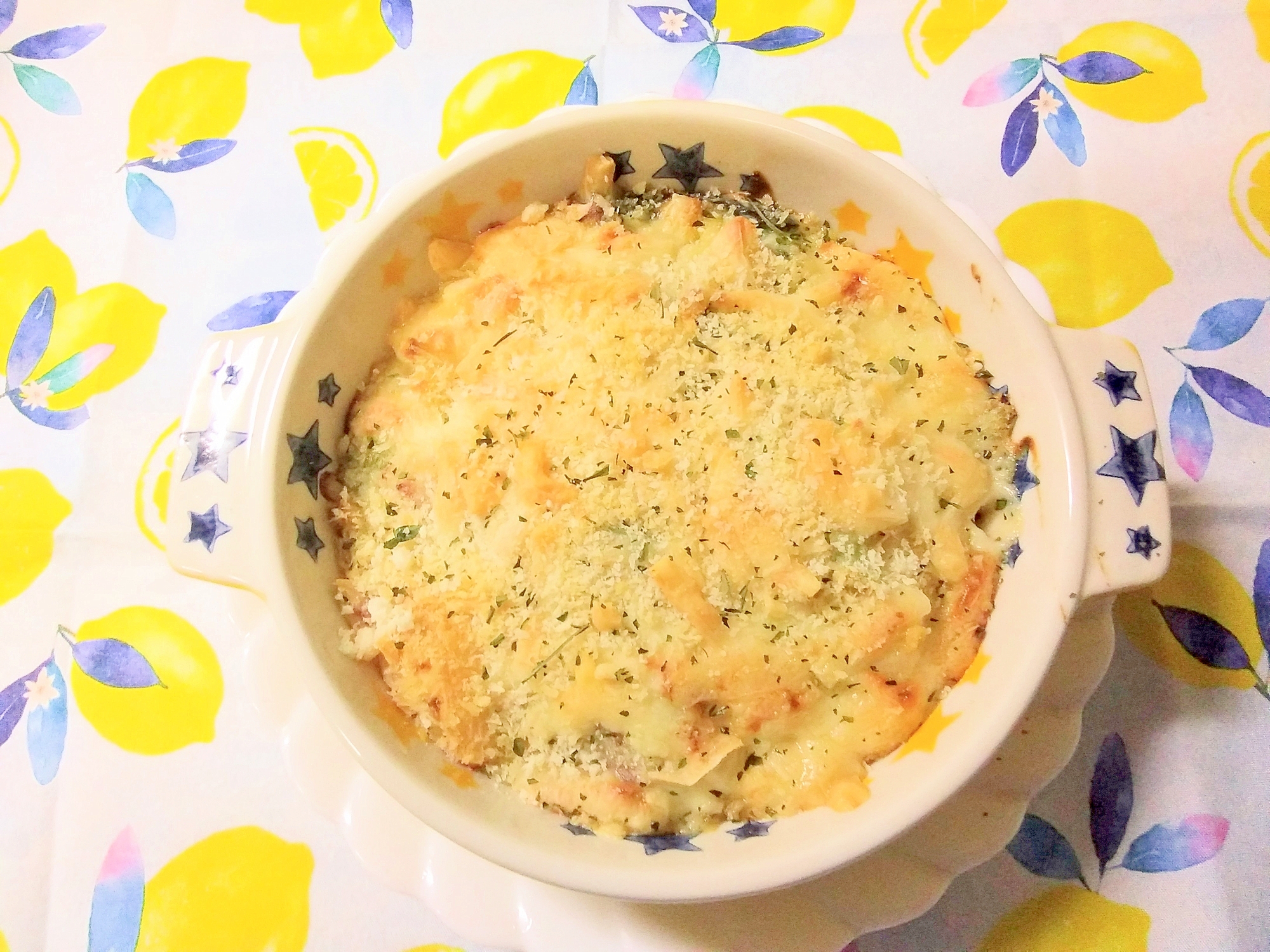 レシピタイトル:小松菜たっぷりマカロニグラタン
