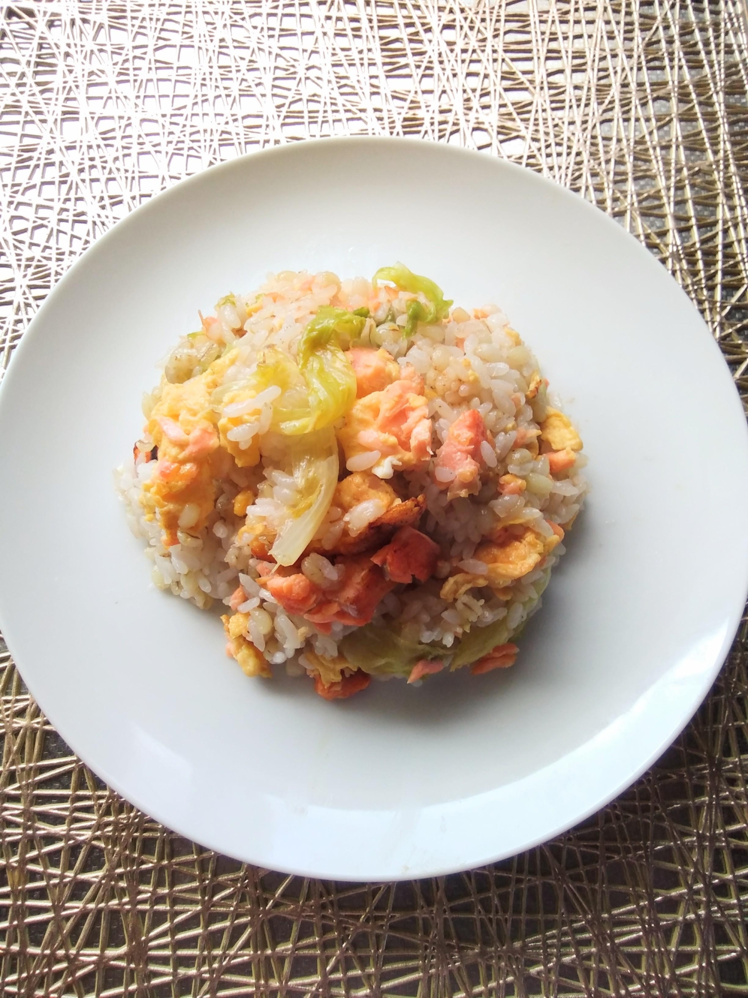 レシピタイトル:鮭とレタスと卵のもち麦チャーハン