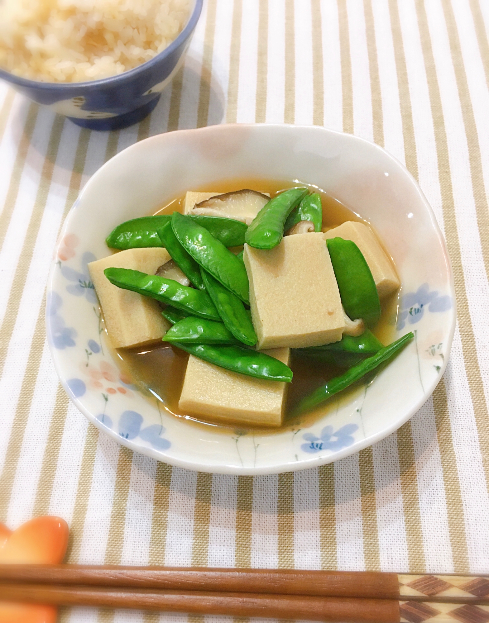 レシピタイトル:春の風味♡絹さやと高野豆腐の煮物♪