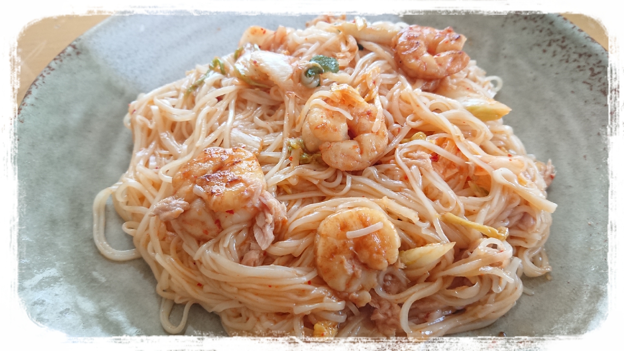 レシピタイトル:エビとキムチとツナのそうめんチャンプルー