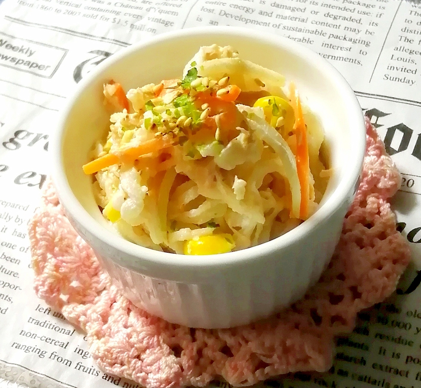 :切り干し大根と人参を丸ごと使用! ツナと共に醤油マヨネーズで和えて、子どもさんも食べやすい味に仕上げています。