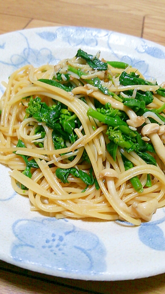 レシピタイトル:しらすと菜の花とブナピーのバター醤油パスタ