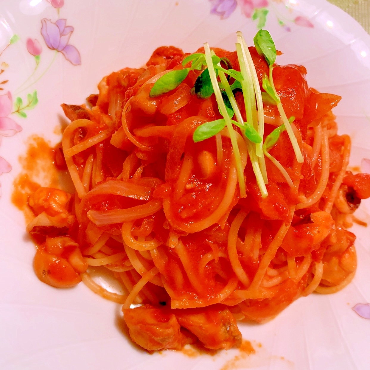 レシピを考えた人のコメント:魚介のうまみたっぷりのトマトソースがしっかり絡みます。