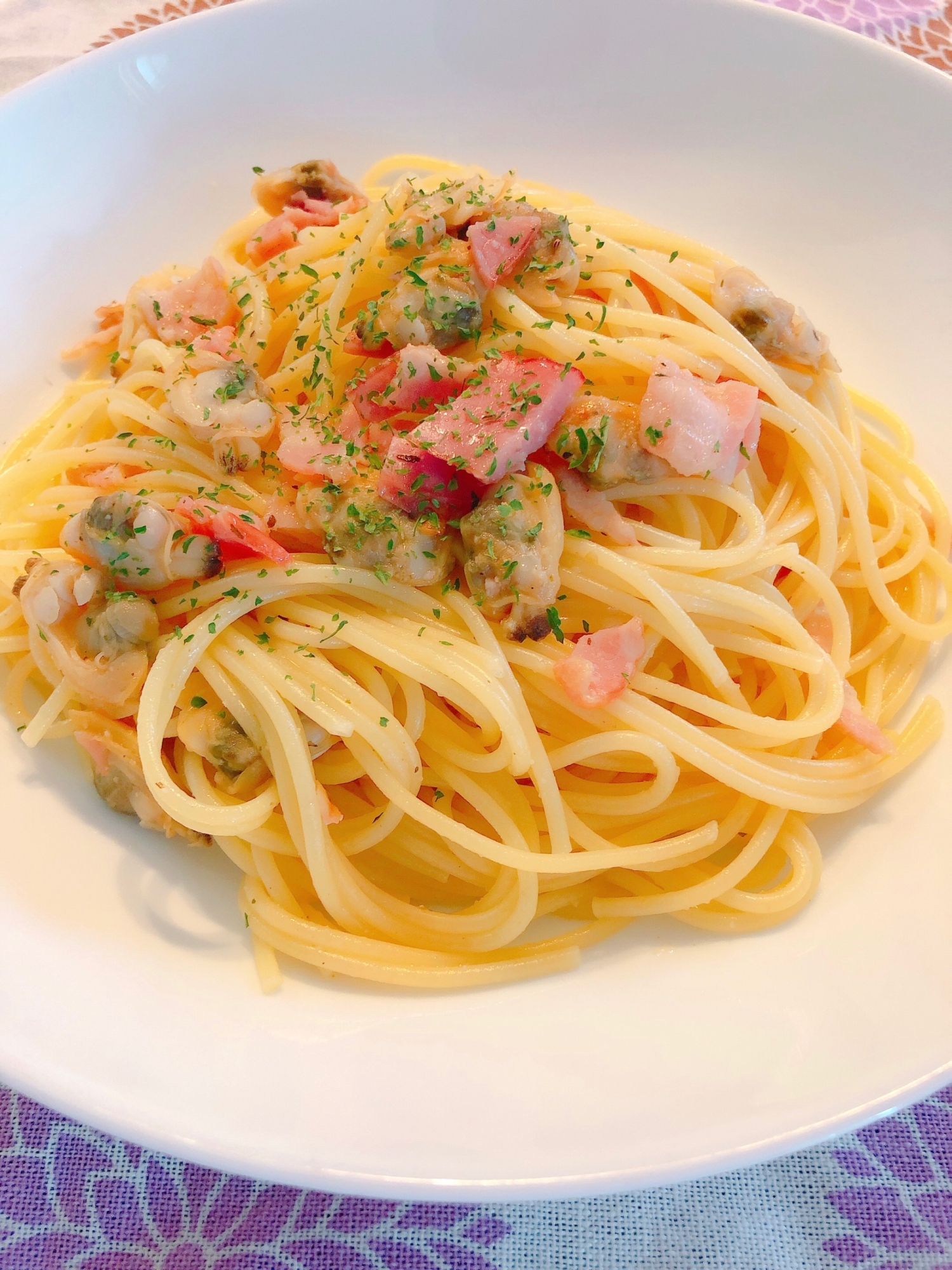 レシピタイトル:アサリとベーコンのパスタ(ガーリック風味)