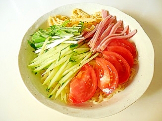 レシピを考えた人のコメント:麺の上に、お野菜とハムとタマゴをのせて、具だくさん♪