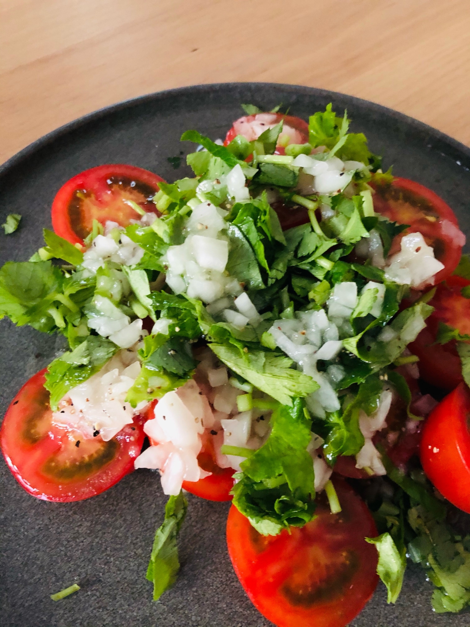 レシピを考えた人のコメント:万能☆新玉ドレッシングをかけたフルーツトマトと三つ葉のサラダです。