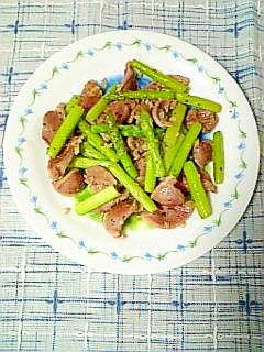 :コリコリの砂肝をアスパラと炒めました♪ ガーリックの香りが食欲をそそります☆ ビールのおつまみにピッタリですよ^-^b