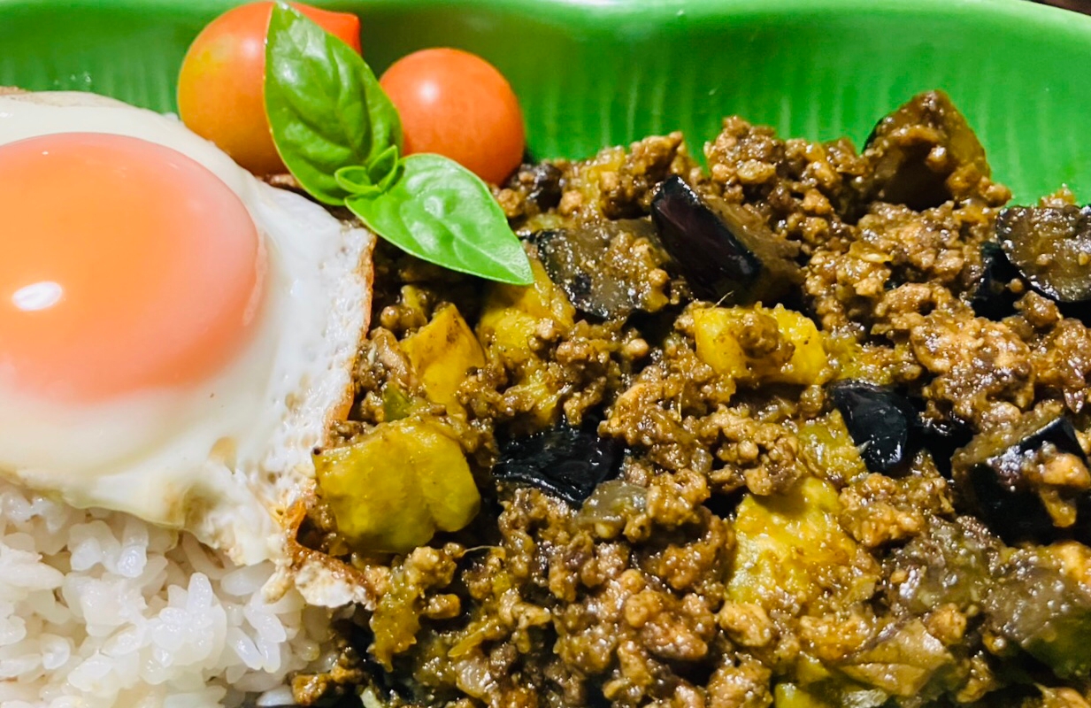 :にんにく塩麹入り♪日本かぼちゃとなすのドライカレー