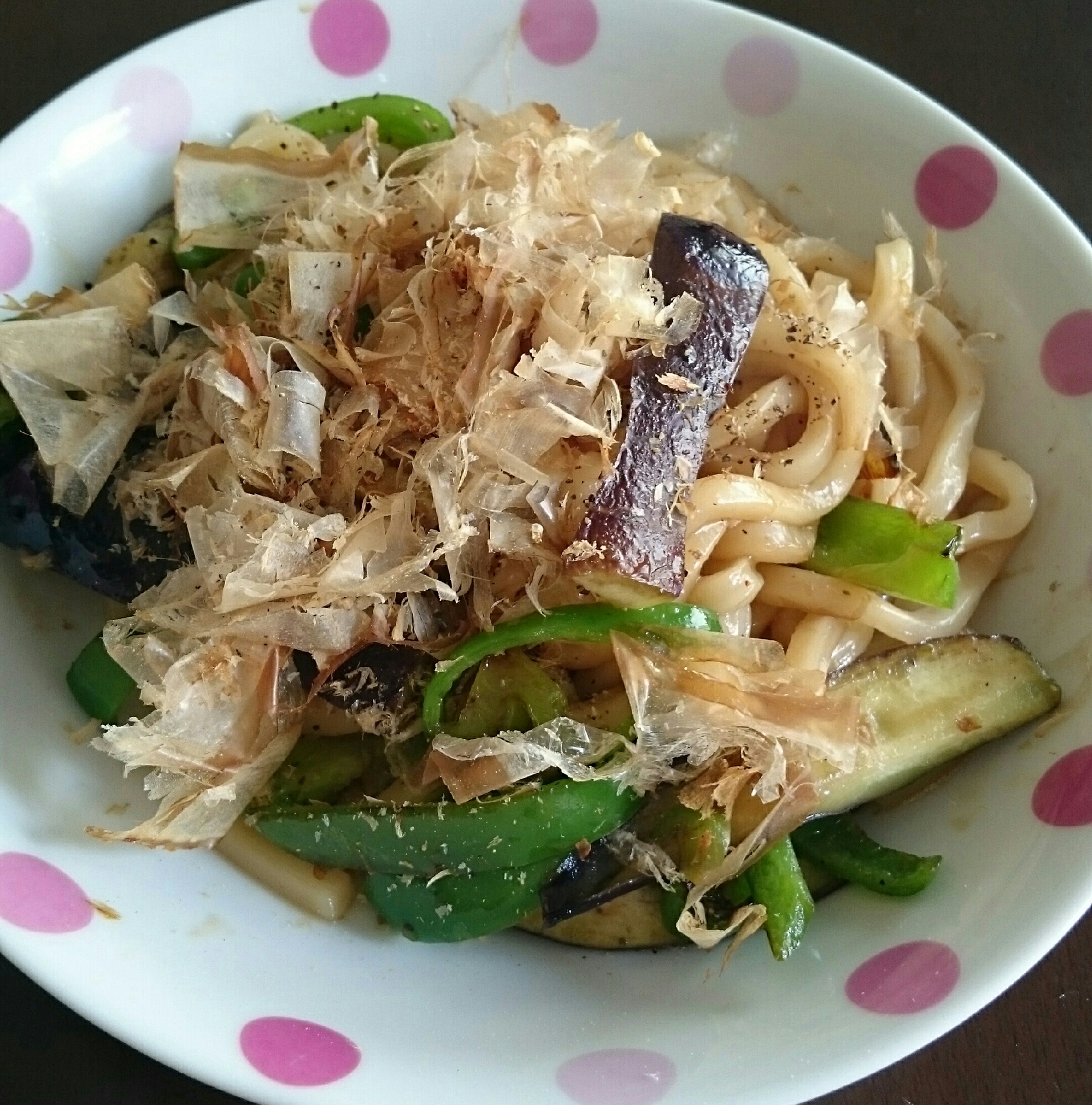 レシピタイトル:ナスとピーマンの簡単焼きうどん