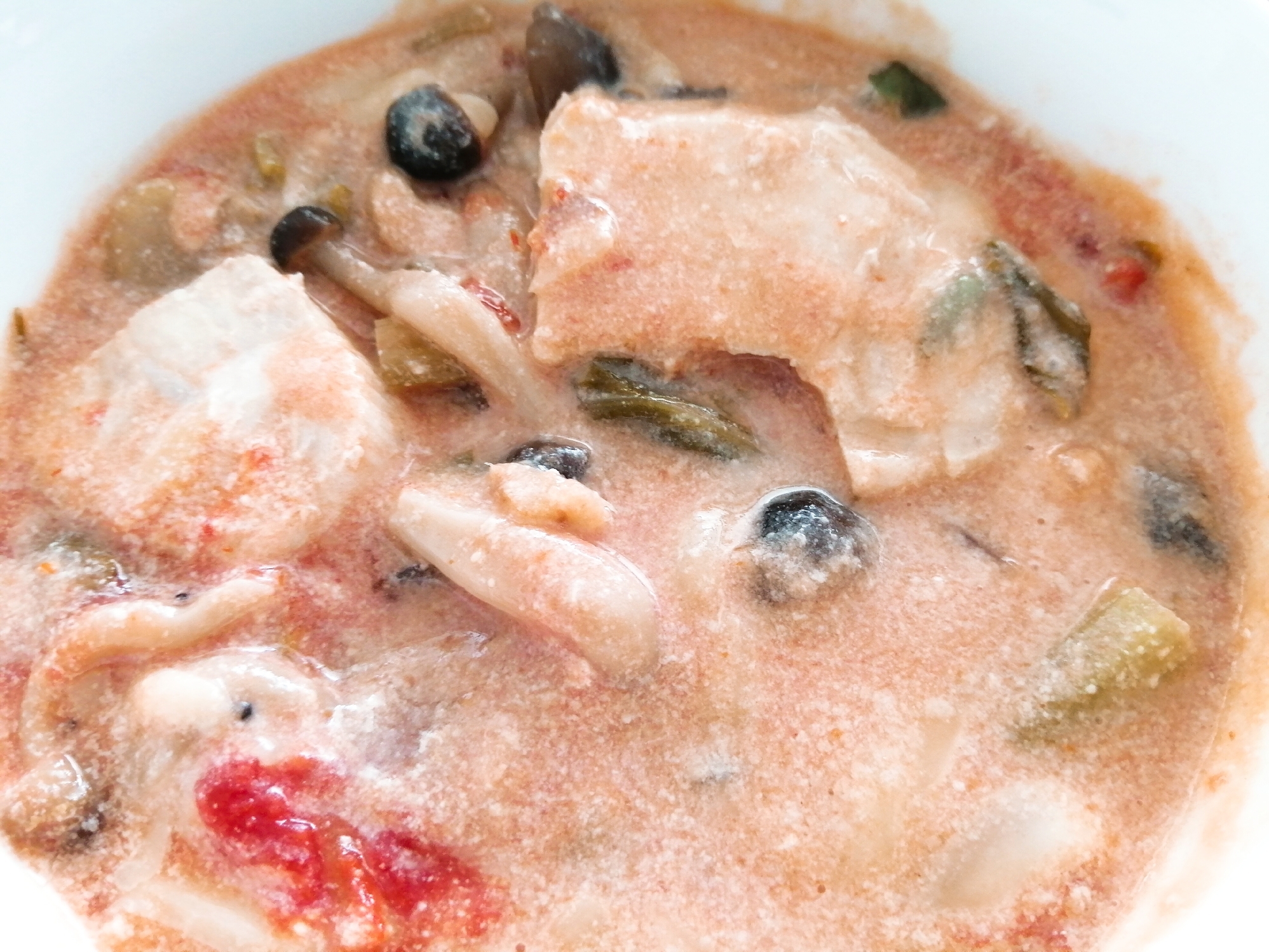 :安かったお魚を使い、家にある野菜を消費♪ トマト缶と豆乳がよく合います! 家にあったのでセロリ入れましたが、主張が激しめでしたので、他の野菜でもいいかもです。