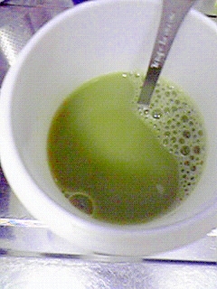 :ジャスミン茶にレモンを入れ、市販の抹茶オーレと合わせました。甘酸っぱく、爽やかなおいしさの抹茶オーレに変身♪