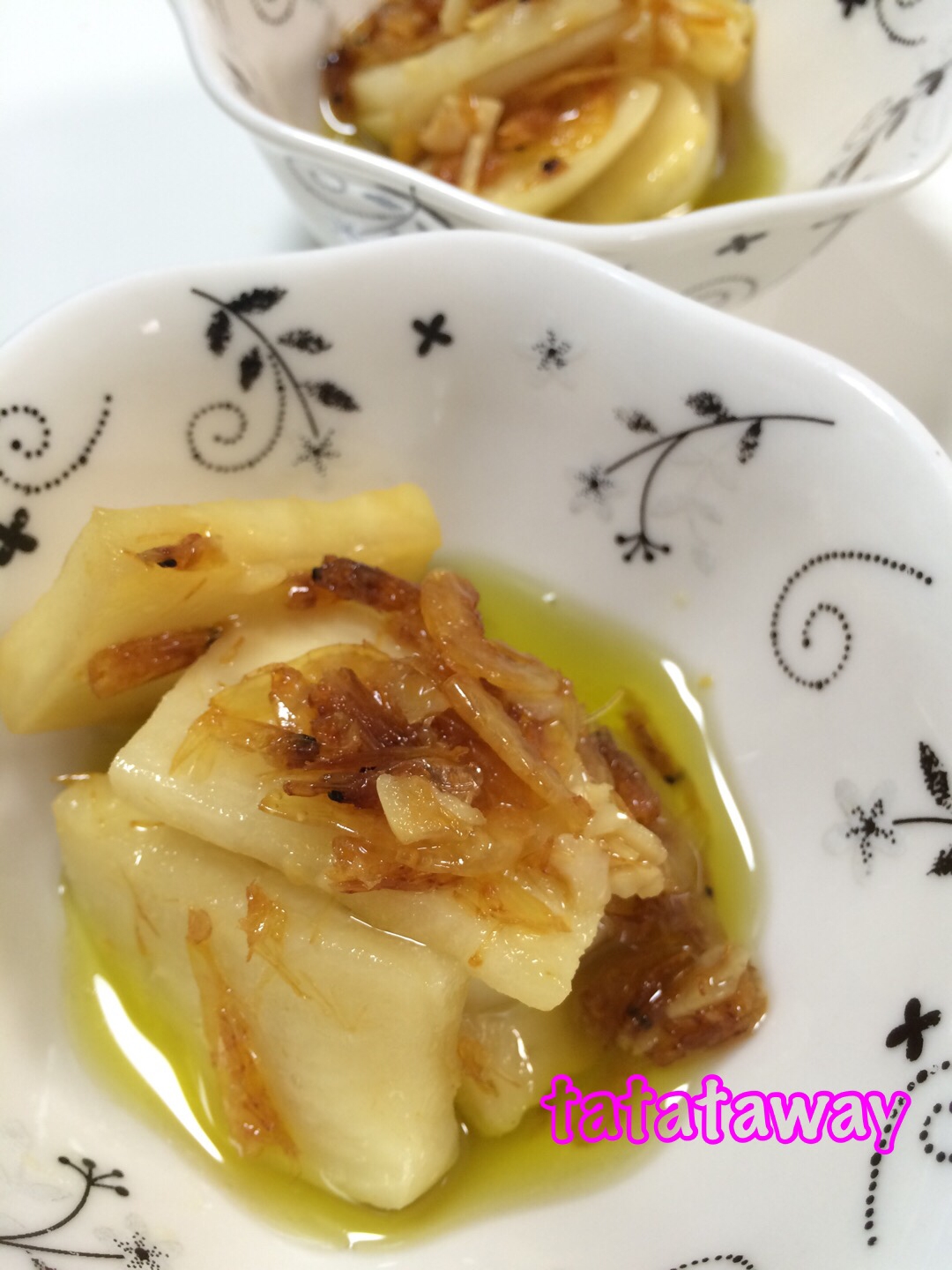 :桜エビの香りがふわっと香る炒めものです!オリーブオイルは多めなので、ソースとしても、パンにつけても合います!