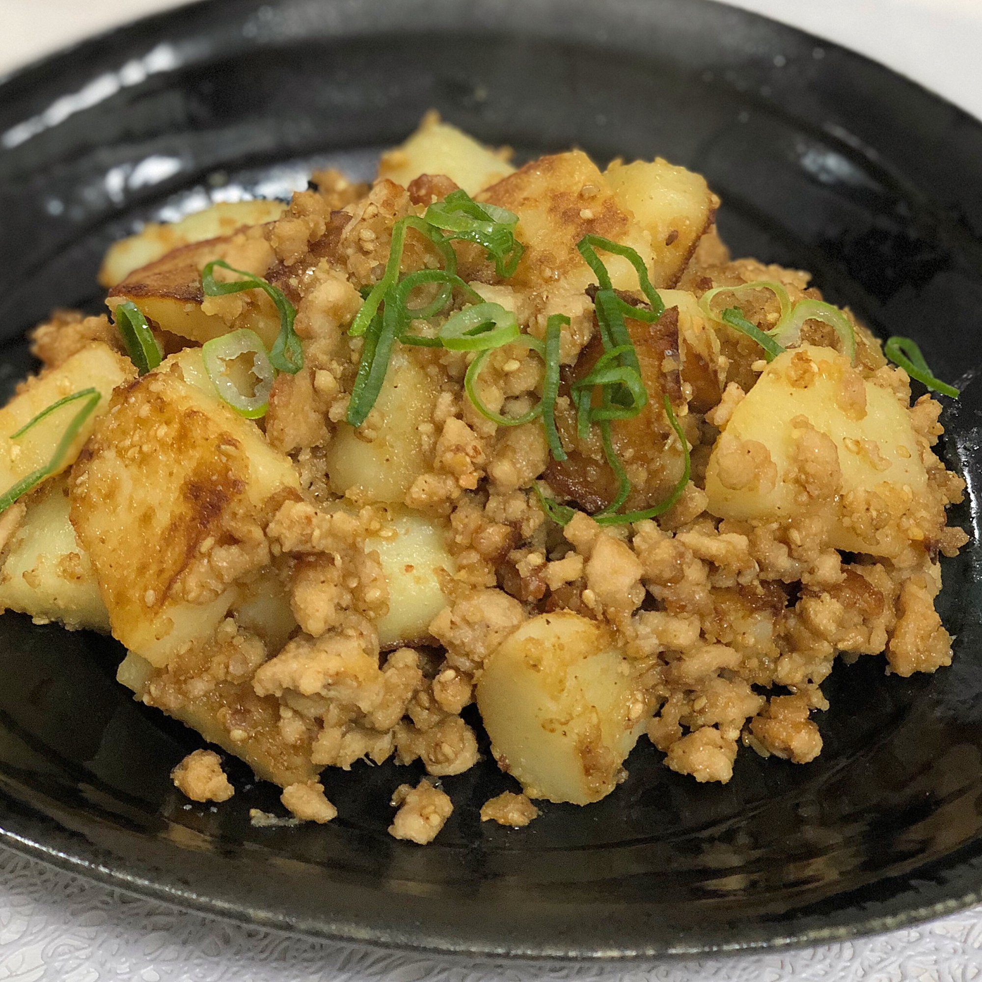 レシピを考えた人のコメント:鶏ひき肉とじゃがいもを白ゴマたっぷりと味噌で炒めました。白ゴマの風味と味噌のコクが絡まって◎