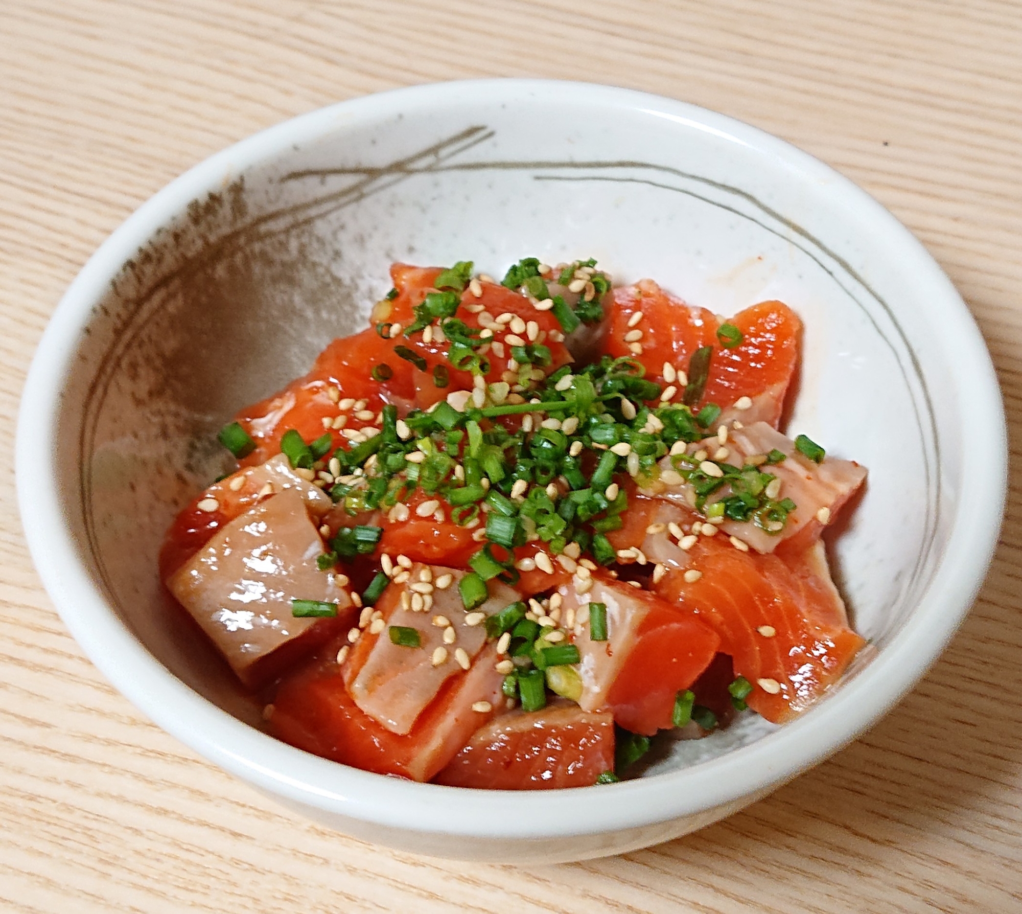 レシピタイトル:簡単おつまみ☆ごろっとサーモンユッケ