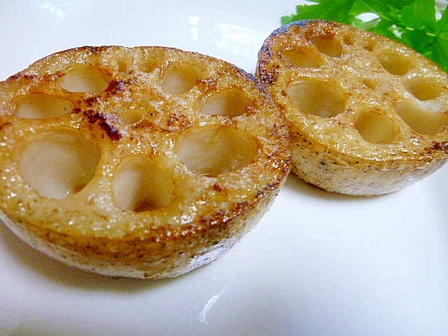:厚切りれんこんを皮つきのままフライパンで蒸し焼きにし、れんこんの歯ごたえと自然な甘みを豪快に味わいます。