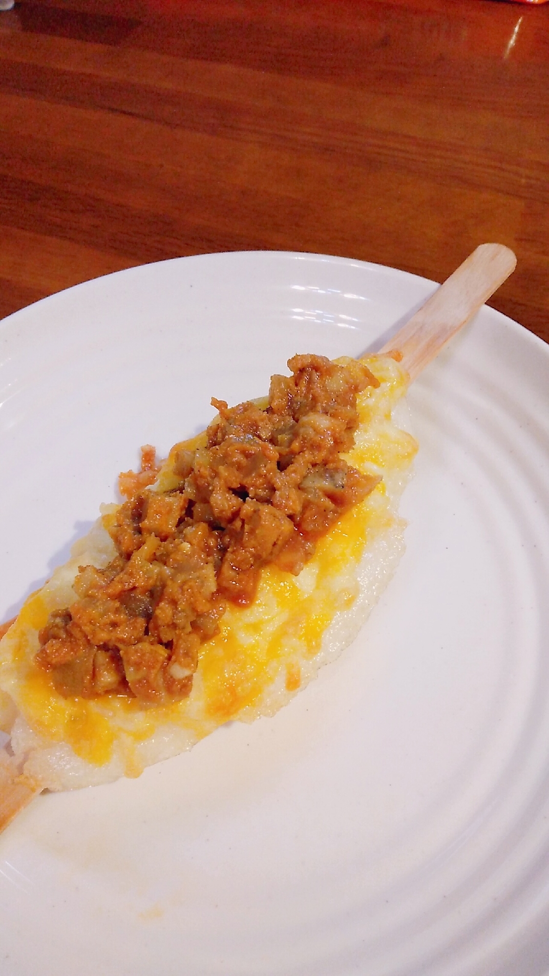 レシピを考えた人のコメント:蓮根のキーマカレー(エミ子のお手軽キッチン参照)を五平餅に塗りチーズ焼きにしました!