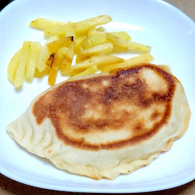 :冷凍しておいたピザ生地を使って残ったミートソースとモッツァレラチーズを包んで焼いたカルツォーネ。 ランチやお夜食おつまみにも♪