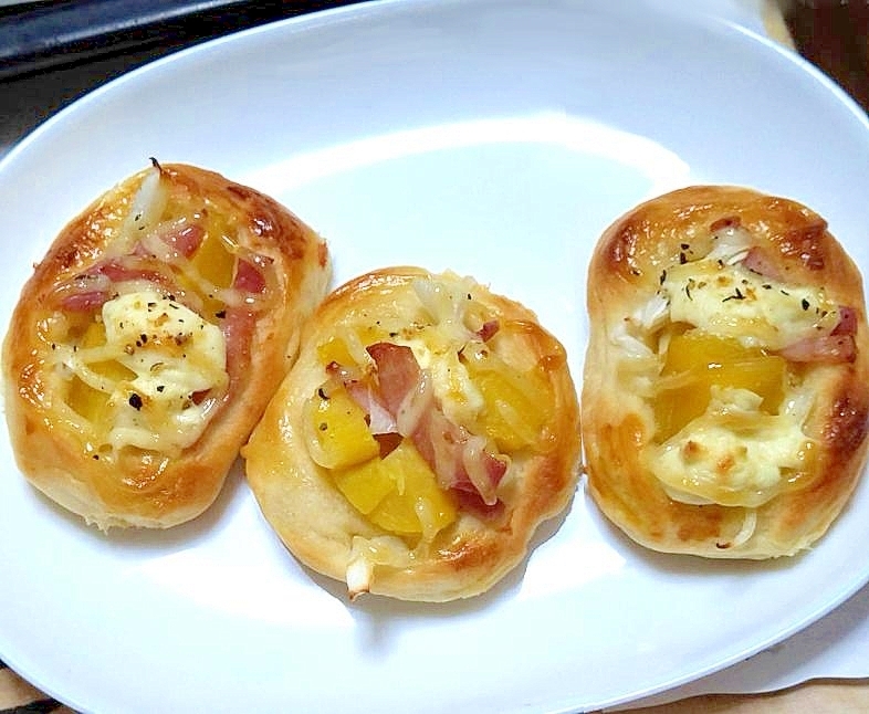 レシピを考えた人のコメント:パン生地にジャーマンポテトの具材を乗せて焼いた惣菜パン♪ ランチや軽いお夜食に♡