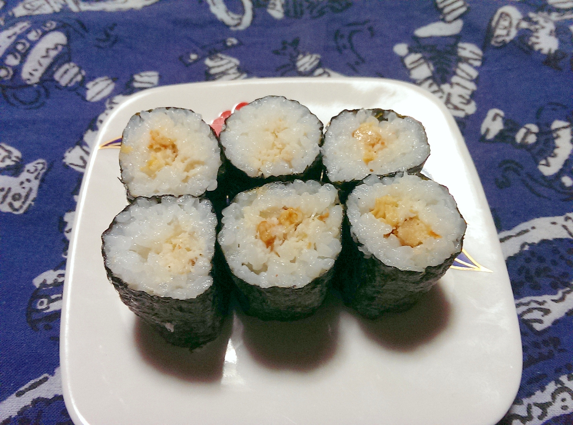 :ほぐしたカニの身にマヨネーズを混ぜて細巻き寿司を作りました。