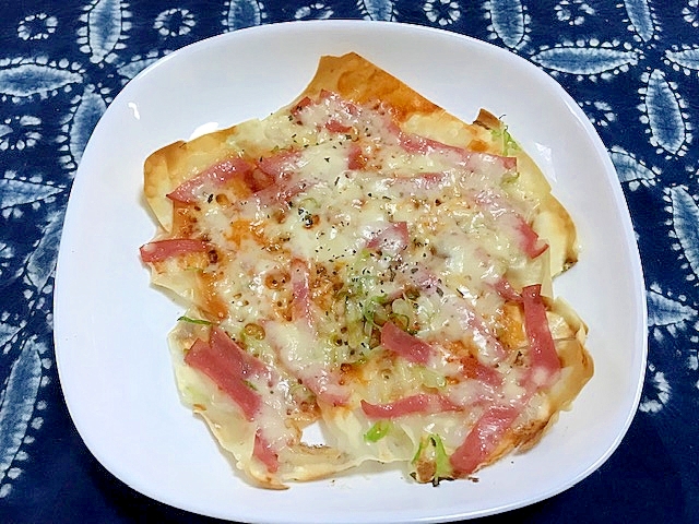 レシピタイトル:ワンタンの皮で作るパリパリピザ風おつまみ