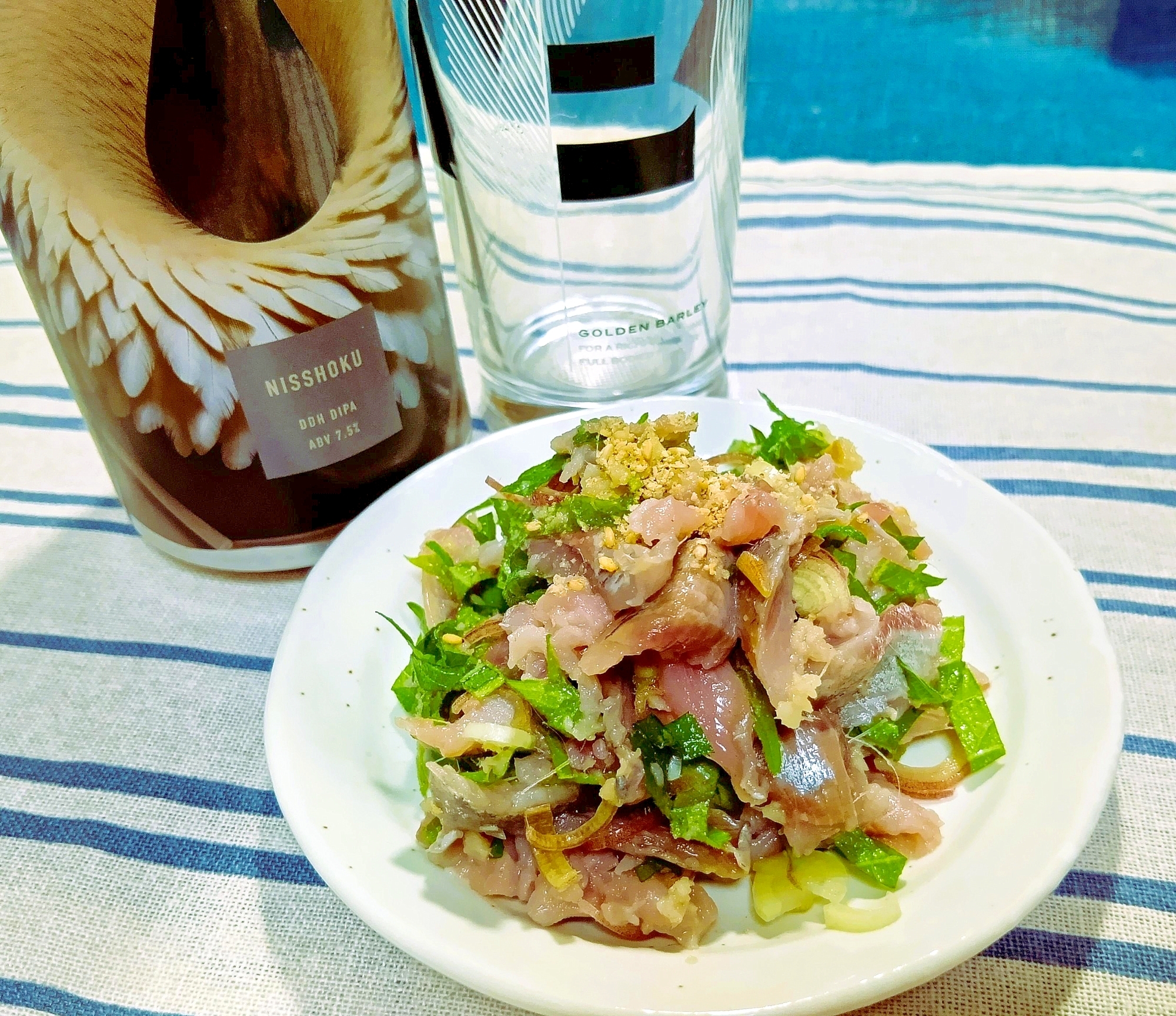 :今回は、果実類の濃厚なアロマが広がり、程よいビタリングが全体を引き締めるヘイジーダブルIPAに、生姜がきいたイワシたたきの香味野菜和えをペアリング。